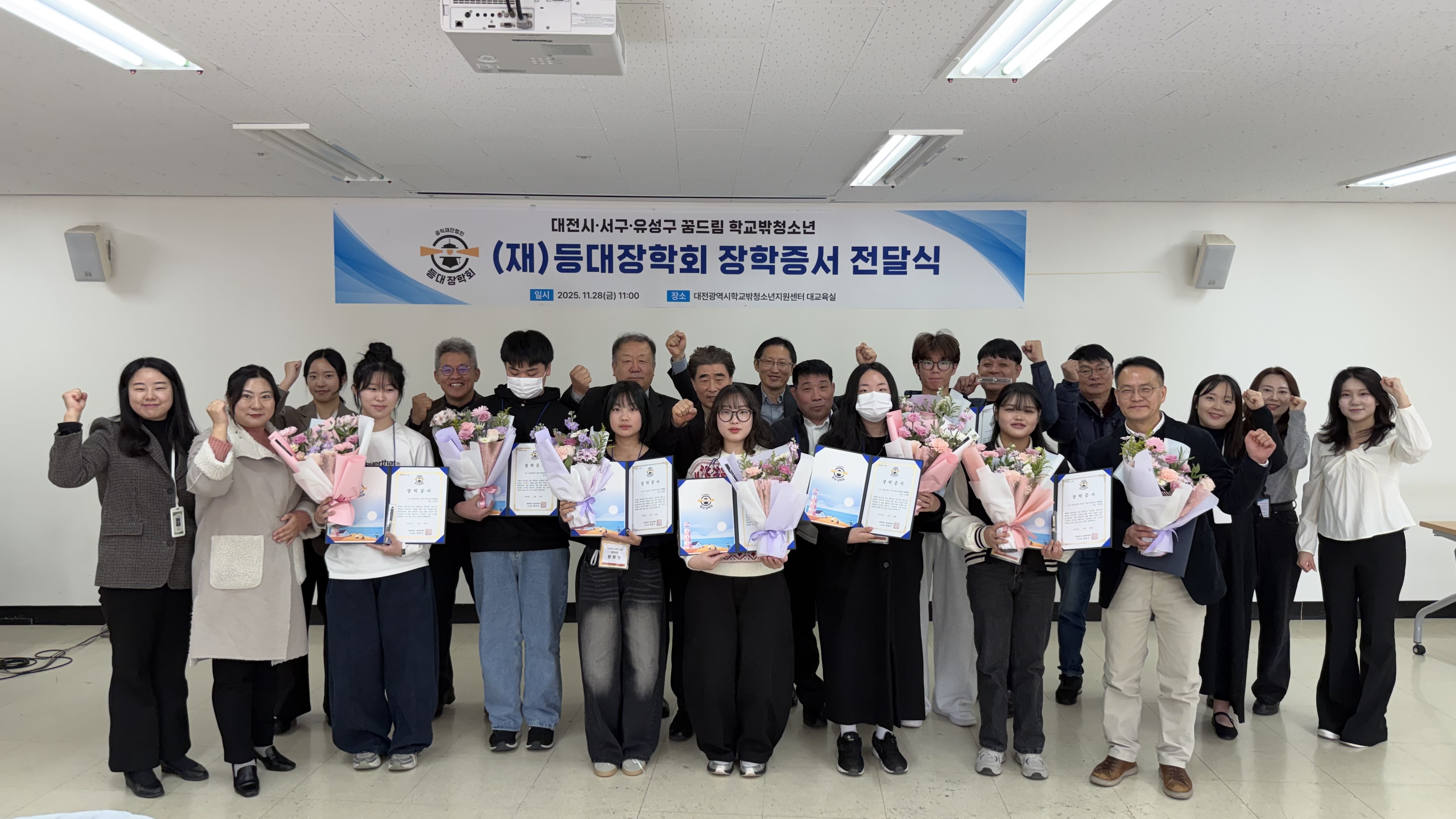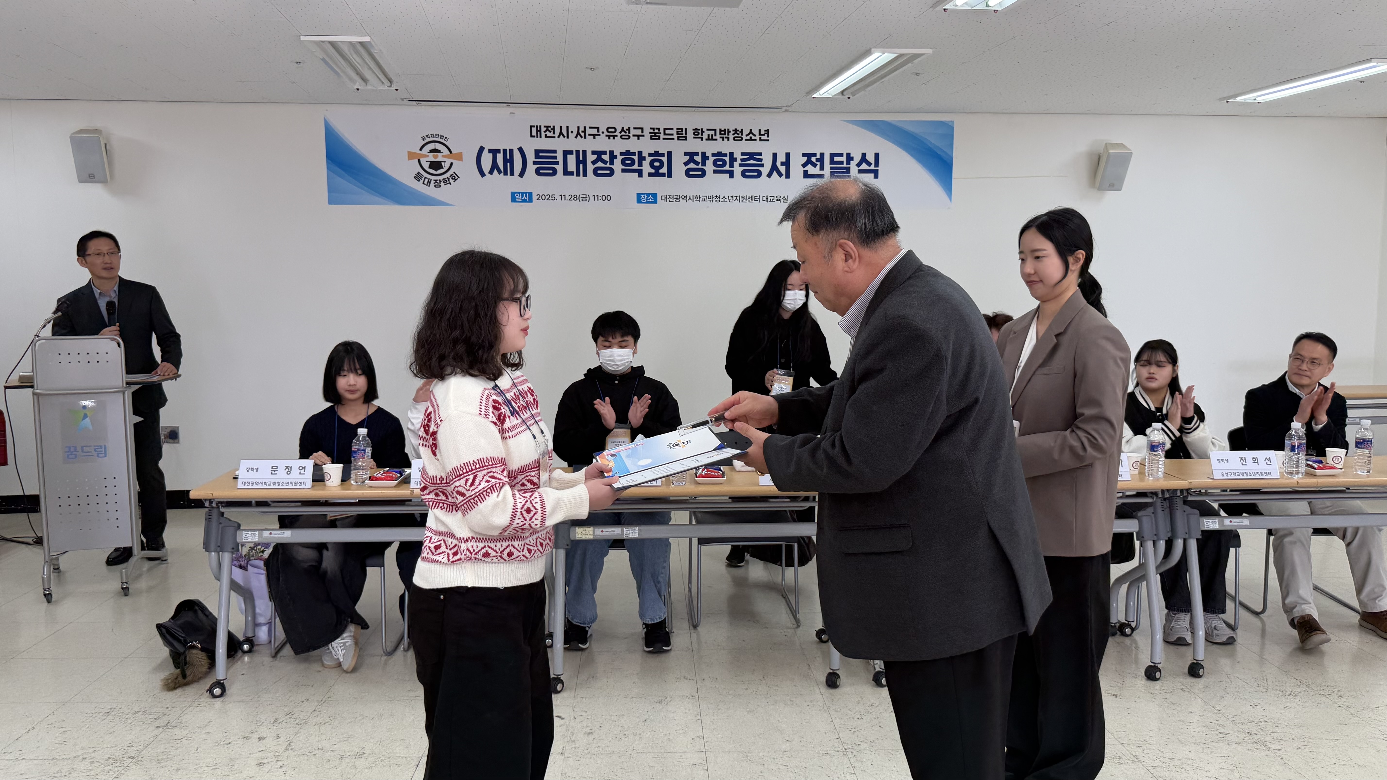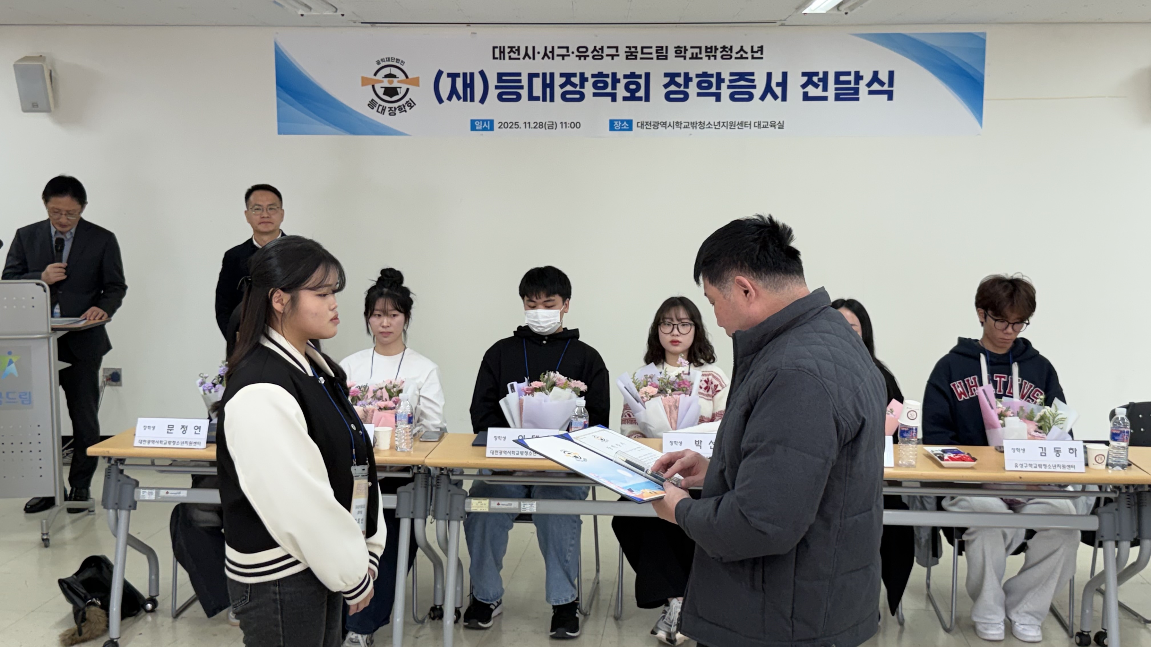 오늘 오전 등대장학회(이사장 장동익)는 대전 지역 학교 밖 청소년들에게 장학금을 전달했습니다. 8월 경기, 10월 경남에 이어 세 번째 만남입니다. 다음 달 12월 15일에는 광주에서 장학금을 전달할 예정입니다.